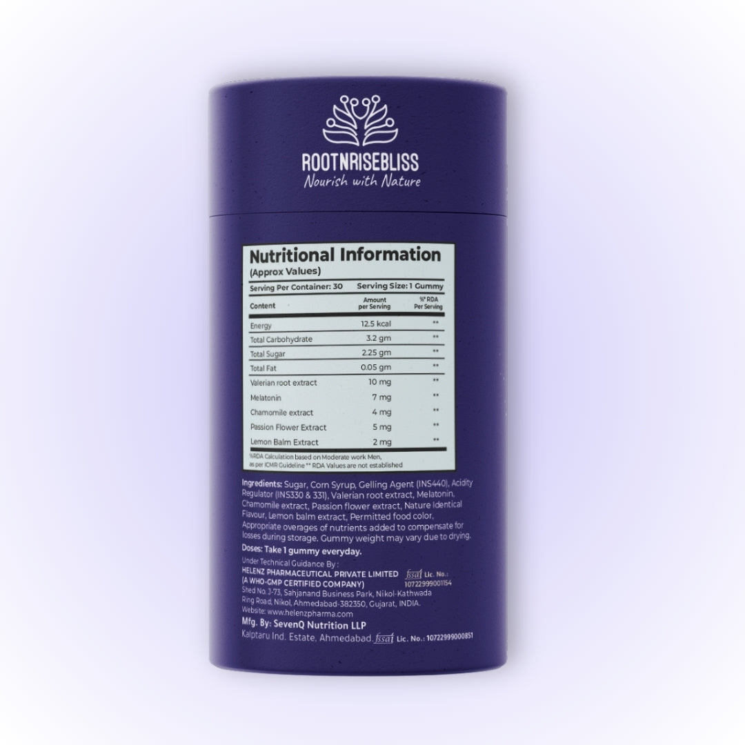 RootnRiseBliss Sleep Time Melatonin Blueberry Gummies are a simple and tasty way to improve your sleep naturally. Each gummy delivers 5mg Melatonin, supported by Valerian Root, Chamomile, Passion Flower & Lemon Balm extracts—a powerful herbal blend known to relax the mind, reduce stress and support deep sleep.